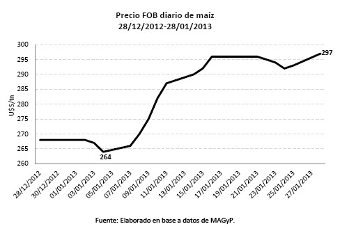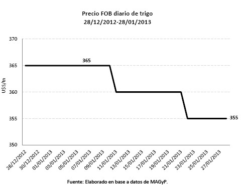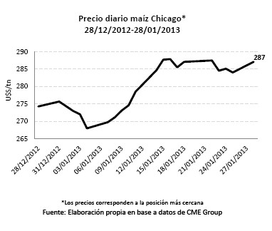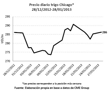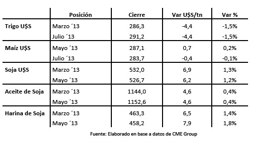 El precio del trigo perdió U$S 4,4, tanto en la posición Marzo 2013 como en la posición Julio 2013. Los precios de los contratos de maíz aumentaron U$S 0,7 en la posición más cercana