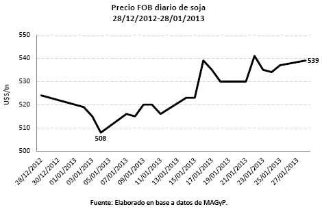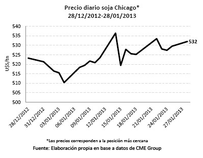 Los precios futuros en el Mercado de Chicago subieron en la última semana, con excepción de los precios del trigo y la posición Julio 2013 para maíz. El precio del poroto de soja subió tanto en la posición Enero 2013 (+U$S 6,9) como en la posición Mayo 2013 (+U$S 6,2). El precio de la harina ganó U$S 6,5 en la posición más cercana, mientras que el precio del aceite subió levemente (+U$S 4,6).