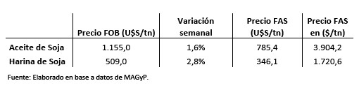Contrariamente a la semana pasada, el precio de la harina de soja aumentó U$S 14. El precio del aceite de soja experimentó nuevamente una suba, siendo la misma de U$S 18.