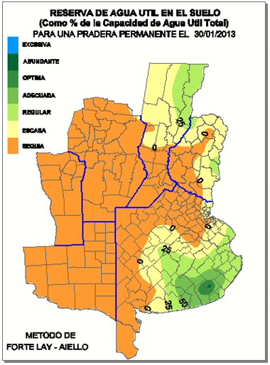 Para graficar lo que estamos señalando mostramos un mapa al 30/01/13 QUE REPRESENTA LA RESERVA DE AGUA UTIL DEL SUELO PARA UNA PRADERA PERMANENTE donde puede verse la crítica situación. Recordar que las reservas para un cultivo soja serían algo mayores a las aquí representadas.