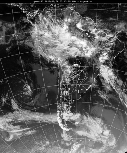 Imagen de satélite de la mañana del miércoles 6/2, en donde se observa la presencia de nubosidad sobre buena parte del noroeste Argentino. Se observan algunas tormentas y lluvias en forma aislada, sobre San Luis, Mendoza y hacia el este de las sierras de Córdoba. Además se observa nubosidad sobre el centro-sur de la Patagonia en respuesta al avance de un sistema frontal por la zona.