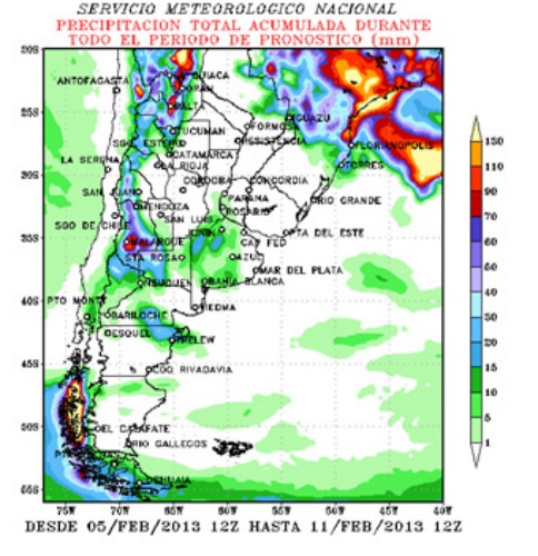 Si se observa la figura (Fuente modelo E.T.A (S.M.N.), que corresponde al pronóstico de acumulados de precipitación para los próximos 5 días sobre gran parte de la Argentina y del Sur de Sudamérica, se puede apreciar lo siguiente: las regiones que no presentan colores son las regiones que no registrarán precipitaciones, mientras que las regiones que registran colores (ver escala a la derecha) son las que sí registrarán precipitaciones.