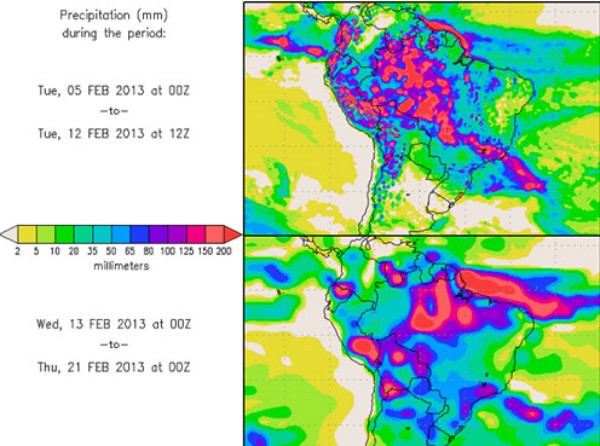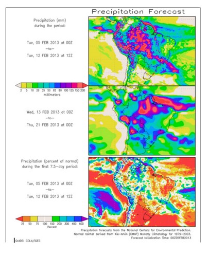 Mapas de pronósticos de precipitaciones sobre la región de Sudamérica. En el primer mapa (superior) se observa la precipitación acumulada pronosticada para los próximos 7 días, mientras que en el segundo mapa (medio) se observan los valores de precipitación acumulada pronosticada entre el día 06 y el 14 del próximo mes. Por último, se muestra un mapa de pronósticos de anomalía de precipitación (inferior) para los próximos 7 días en el cual puede observarse si las precipitaciones pronosticadas en el mapa superior están por encima o por debajo de los valores medios para esta época del año.