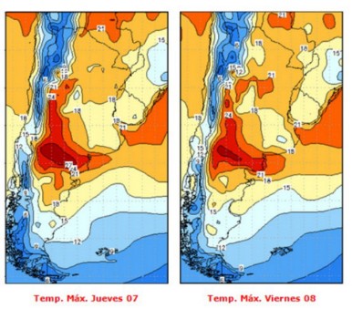 En cuanto a temperaturas, se esperan valores muy elevados sobre el norte de la Patagonia, cuyo y el Noroeste Argentino, mientras que más al este, si bien las temperaturas estarán elevadas, no serán tan extremas como en las zonas citadas anteriormente. Asimismo, se esperan tormentas y chaparrones sobre buena parte de Bolivia, Centro y norte e Paraguay y los estados del sur de Brasil.
