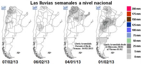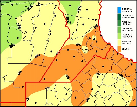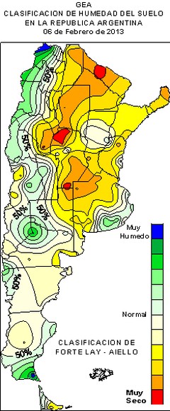 En el contexto de esta campaña atípica, donde coexistieron los excesos hídricos del 2012 y la seca actual, cada día sin lluvias cobra mayor relevancia. Durante la semana actual se presentaron algunas precipitaciones dispersas y temperaturas muy elevadas en toda la región GEA. La provincia de Córdoba fue la zona que recibió las mayores precipitaciones, con núcleo en la localidad de Pozo del Molle, donde se registraron 43,2 mm. En el resto de la región se observaron acumulados de entre 30 y 40 mm en el norte de GEA, y ausencia total de precipitaciones en el norte de Buenos Aires. Analizando las temperaturas máximas, podemos ver que fueron muy elevadas a lo largo de la semana, principalmente en el comienzo del período, llegando a 39,9°C en la localidad de Rufino. En promedio, en la región, los valores estuvieron muy por encima de los parámetros típicos para la época del año. Con estas condiciones, a causa del balance entre las escasas lluvias y la fuerte evapotranspiración, continuó el deterioro de las reservas hídricas y se generalizaron las zonas que presentan características de sequía.