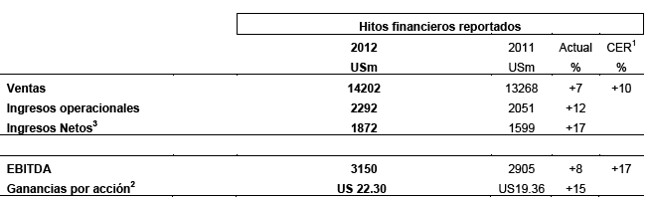 El retorno del flujo de efectivo de la inversión fue del 15%, otra vez superando el objetivo del 12%. La proporción de deuda neta a capital contable fue del 20% (2011:15%). El retorno total de dinero a los accionistas en 2012 fue de US 795 millones. El dividendo se elevó a un 14%, o 13% en dólares estadounidenses, generando un dividendo total de US 791 millones.