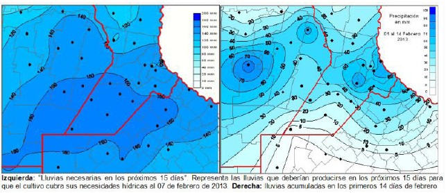 Estos sectores continúan en situación de sequía. En la imagen de las precipitaciones de los primeros 14 días de febrero se puede apreciar con claridad cómo ha sido la distribución de agua.