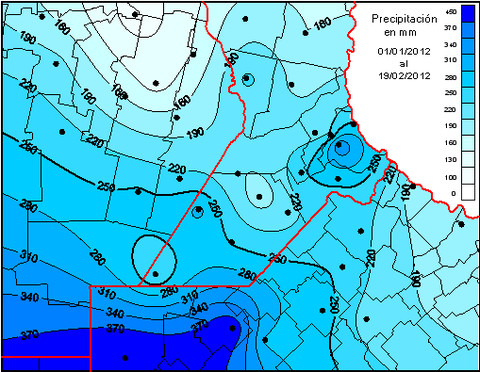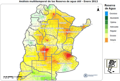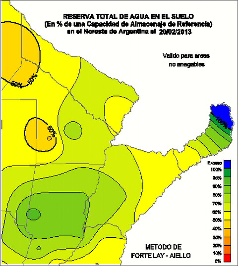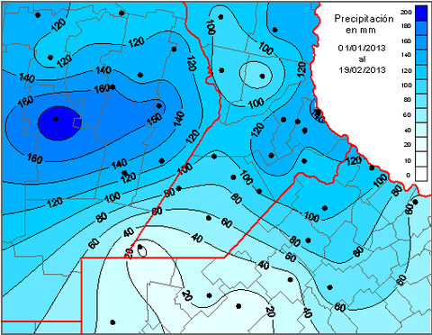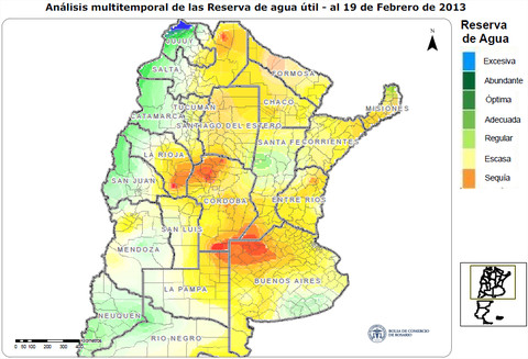 Las lluvias llegaron tarde con volúmenes poco significativos y en forma errática en febrero. Algunas lluvias intensas pero muy dispersas comenzaron el 13 de febrero privilegiando un radio de 80 km de Rosario y continuaron el 14 de febrero por el noreste de Santa Fe, llegando a una pequeña parte del sudeste de Santiago del Estero y noreste de Córdoba. Del 18 al 20 de febrero nuevos frentes mejoraron la franja central que va del norte de entre Ríos, al centro de Santa Fe y norte de Córdoba. Sobre los últimos días mejoró la condición hídrica en el área central de Chaco y el noreste de Buenos Aires. La diferencia con el año pasado es la oportunidad, el agua caída y la cobertura. En febrero de 2012, las lluvias importantes llegaron el 8, con acumulados de más de 100 mm y con una muy amplia cobertura sobre la región central del país.