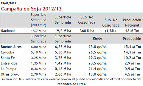 A diferencia del informe de enero pasado, donde se trabajó con proyecciones de rinde en base a comportamientos históricos, en este mes se efectúa una estimación de rendimientos que deja definitivamente lejos la posibilidad de alcanzar las 53 millones de toneladas proyectadas. Las condiciones bajo las cuales empezaron a definirse los rindes permitieron estimar el rinde promedio en 25 quintales por hectárea a escala nacional. Sobre la base de una superficie no cosechable de 360.000 hectáreas, la producción de soja que podría obtenerse en la temporada 2012/13 ascendería a 48 millones de toneladas. En el cuadro que sigue se muestran los datos estimados detallados por provincia, mientras que para Entre Ríos se utilizan los datos de SIBER (Bolsa de Cereales de Entre Ríos).