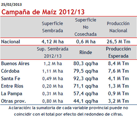 La producción de maíz disminuyó 1 millón de toneladas respecto del informe anterior, por lo que quedó estimada en 25,5 millones de toneladas. El rinde promedio nacional se calculó en 3 quintales menos, ascendiendo a 72 qq/ha de maíz.