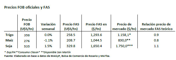 Comparando el precio de mercado con el precio FAS teórico, en el caso del maíz y el trigo, el productor recibe el 80% y el 90% respectivamente. Por su parte, el precio de mercado de la oleaginosa excede su valor de paridad en un 10%.