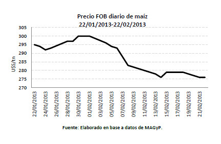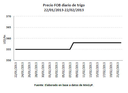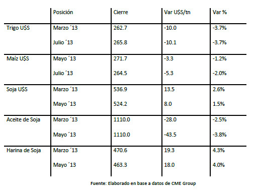 En el período observado, la mayoría de los precios futuros en el Mercado de Chicago cayeron, el precio del maíz experimentó pérdidas del 2,0%. El pecio del trigo perdió 3,7% en la posición Marzo 2013 y Julio 2013 respectivamente. En tanto, sólo la soja y la Harina de Soja lograron recuperar precio en los últimos 10 días.