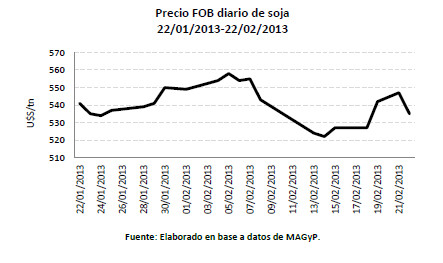 El precio futuro para la oleaginosa en la posición más cercana fue de U$S 536,9 un U$S 13,5 superior al de la semana anterior. Para la posición Mayo 2013, el precio de los contratos fue de U$S 524,2, con una variación porcentual positiva de 1,5%. De los derivados de soja, en este período resultó más perjudicado el precio del aceite, con pérdidas que rondaron los U$S 43,5 para la posición Mayo 2013.