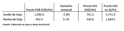 Al igual que el precio de la soja en el tramo final del período relevado en este informe, el precio del aceite de soja también cayó, a razón de 30 dólares por toneladas en los últimos 10 días, mientras que el precio de la harina registró un aumento de 15 dólares/ tn .