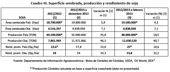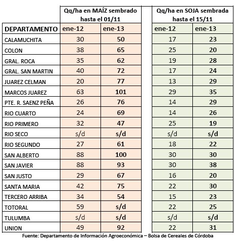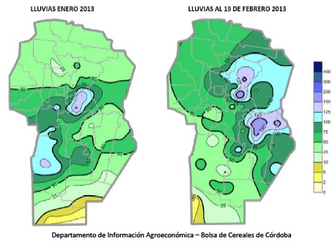 Las escasas lluvias y altas temperaturas de mediados de enero produjeron mermas en el rendimiento esperado de lotes tempranos. No obstante, considerando una primavera de lluvias copiosas, se estiman rendimientos de lotes tempranos campaña 2012/2013 marcadamente superiores respecto al ciclo anterior que padeciera una importante sequía primaveral. Hasta la fecha, durante el mes de febrero, la zona con mayor lluvia acumulada se ubica al este y noreste de la provincia de Córdoba, decreciendo hacia el sudoeste.