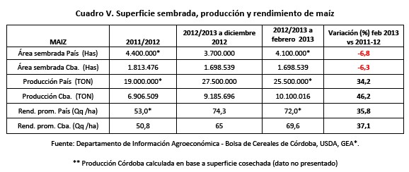 MAÍZ: los departamentos con más descuento de área sembrada registraron son hasta el momento Gral. Roca (24%) y Pte. Roque Sáenz Peña (20%). Ésta superficie que no llega a cosecha es la resultante de aquella destinada normalmente a uso forrajero como también aquella perdida a causa de fenómenos climáticos adversos. La diferencia total a nivel provincia de área sembrada y área cosechada se aproxima a 14% (247.868. has en la campaña en curso y 453.407 has. en el ciclo anterior). Para los cálculos de producción se suponen rendimientos en cultivos tardíos o de segunda similares a los obtenidos en la campaña pasada (2011/12).