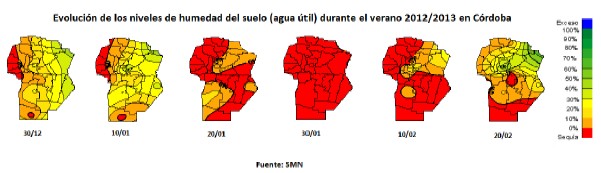 Los cálculos de las últimas estimaciones correspondientes a la provincia de Córdoba, realizadas por la Bolsa de Cereales local, resultan fácilmente corroborados cuando se observa la evolución de la humedad del suelo en los diferentes momentos del ciclo de los cultivos.