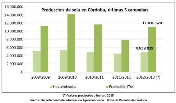 Rendimiento de maíz y soja de primera o temprana campaña 2011/2012 vs 2012/2013 en la provincia de Córdoba. Estimación a Febrero de 2013.