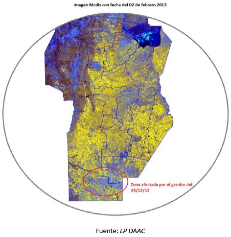 El siguiente mapa muestra el impacto producido por la intensa granizada registrada el 24 de diciembre de 2012.