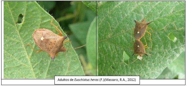 En el cultivo de soja las “chinches” son consideradas las plagas más importantes del período reproductivo. La “chinche marrón” Euschistus heros (F.), como la mayoría de los hemípteros fitófagos, es una especie cosmopolita; se encuentra en cultivos de soja, algodón, girasol, maíz, así como en vegetación natural.