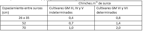 Tabla 1: Umbrales económicos para el complejo de hemípteros que atacan al cultivo de soja durante el periodo reproductivo R3 - R5.5 (*) (**). Gamundi et al. (2003).