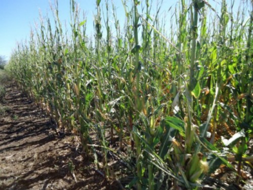 Maíz de 3° (sembrado en Enero) en floración. En la foto 2, maíz que no fue afectado por la piedra