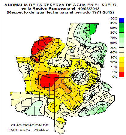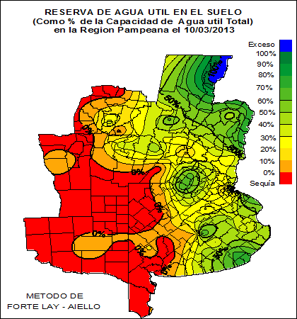 RESERVA DE AGUA ÚTIL EN EL SUELO (como % de la capacidad de agua útil total) en la Región Pampeana el 10 de Marzo de 2013