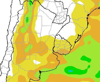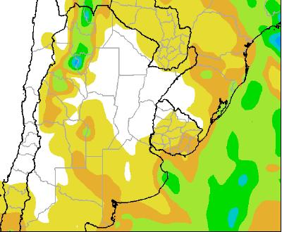 La mayor parte del resto del área agrícola recibirá precipitaciones escasas y dispersas, con amplias extensiones con valores nulos.