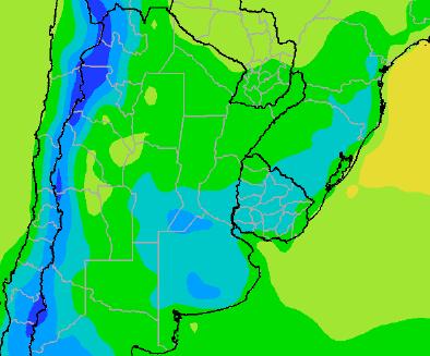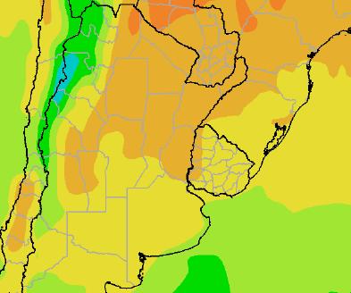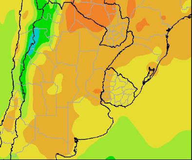 La mayor parte del NOA; el este de Cuyo, la mayor parte de Córdoba, el sur de Santa Fe, la mayor parte de Buenos Aires, el oeste de La Pampa y el sudeste del Uruguay, registrarán precipitaciones moderadas a abundantes, (10 a 25 mm), con algunos focos con valores superiores.