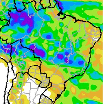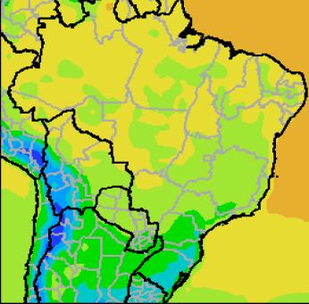 El norte y el sur de Bahía, la mayor parte de Mato Grosso do Sul, el sur de Sao Paulo, la mayor parte de Paraná, de Santa Catarina y Río Grande do Sul, observarán precipitaciones moderadas a escasas (10 a 25 mm).