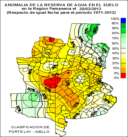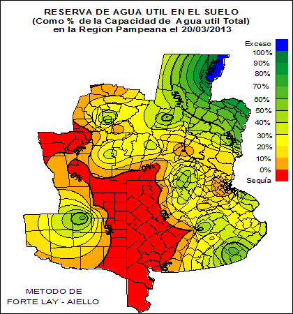 RESERVA DE AGUA ÚTIL EN EL SUELO (como % de la capacidad de agua útil total) en la Región Pampeana el 20 de Marzo de 2013