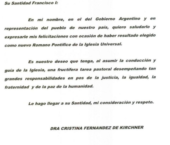 El día de la asunción de Bergoglio como el nuevo Papa, el pasado 19 de marzo, Cristina Kirchner estaba allí en primera fila y fue la primera en saludar al Papa en el momento en que recibió a las comitivas internacionales. A pesar de su relación áspera desde los comienzos de la presidencia de Néstor, la mandataria estuvo allí luciendo su mejor rostro.