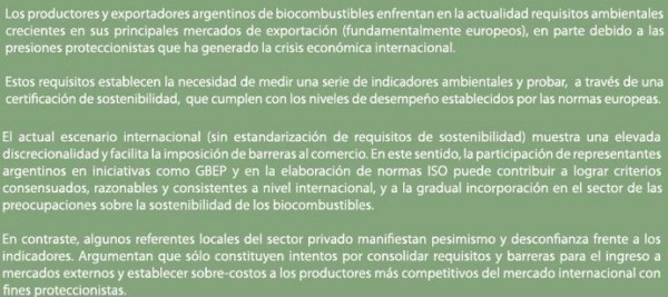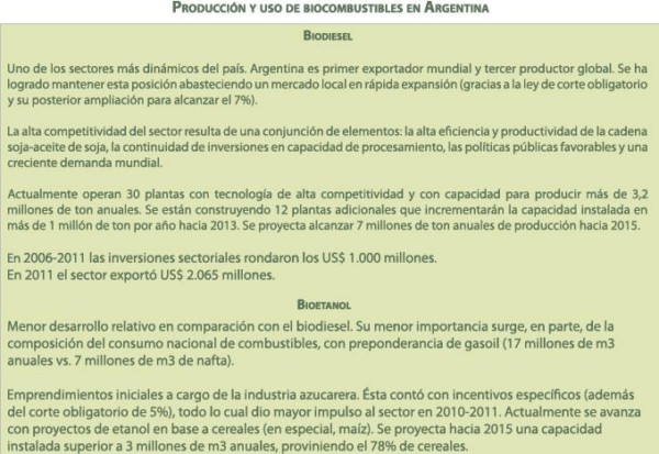 El sector de biocombustibles (y en especial el de biodiesel) ha sido una de las actividades económicas con mejor desempeño relativo durante los últimos años en Argentina. Por un lado, aparece como un caso exitoso de desarrollo productivo: desde 2007 surge como un sector totalmente nuevo que agrega un eslabón adicional de valor a la cadena productiva soja/harina-aceite de soja. Por otra parte, este nuevo sector se ha orientado con gran éxito a la exportación, alcanzando escala y competitividad.
