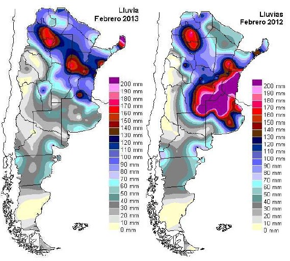 A pesar de las mejoras, se mantuvieron tanto la irregularidad como los comportamientos deficitarios de las lluvias sobre numerosas zonas productivas en la segunda mitad de febrero y en lo que va de marzo. Si no se hubiera contado con las lluvias records del primer semestre de 2012, probablemente estaríamos en un escenario más grave que el del año pasado cuando se perdieron 10 millones de toneladas por la sequía asociada a los efectos de “La Niña”. Comparando los totales pluviométricos de febrero del año pasado y este año en las imágenes que elabora la Consultora de Climatología Aplicada (CCA) (ver imágenes debajo) se aprecia que la cobertura tuvo un patrón mucho más estrecho, sobre todo en el centro, sur y oeste de la región Pampeana. También el volumen recibido de agua fue notoriamente inferior y ha sido un hecho negativo que las recargas se produjeron en fecha más retrasadas y por ende, menos oportunamente para el cultivo de soja.