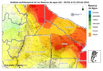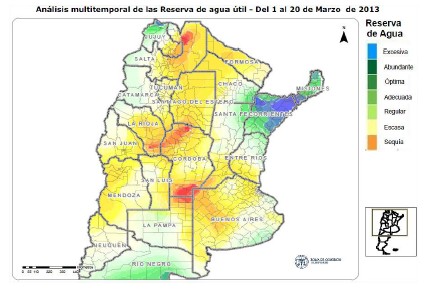 En los siguientes mapas se contrasta la situación de las tres primeras semanas marzo de este año con el período comparable de marzo del 2012 en cuanto a contenidos de agua en el suelo para una pradera permanente. Como referencia, en esos mismos mapas están grisadas las áreas cultivadas con soja: