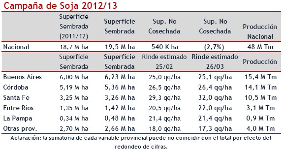 La cifra de producción de soja estimada para este Informe mantiene el guarismo de febrero. Se está calculando una producción nacional de casi 48 millones de toneladas, lo que surge de una superficie sembrada de 19,5 millones de hectáreas, una superficie no cosechable de 500.000 hectáreas y un rinde nacional promedio de 25 qq/ha.