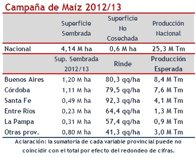 En el caso de maíz, sólo se han reajustado los rindes estimados para el maíz de la campaña 2012/13 en el norte del país y en la provincia de Entre Ríos, con los nuevos aportes del SIBER de la Bolsa de cereales de Entre Ríos. En esta provincia se agregaron 30.000 ha y se considera un rinde provincial de 64,4 qq/ha frente a los 71,1 qq/ha esperados y considerados en la anterior estimación.