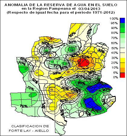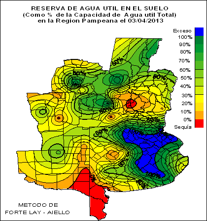 RESERVA DE AGUA ÚTIL EN EL SUELO (como % de la capacidad de agua útil total) en la Región Pampeana el 03 de Abril de 2013