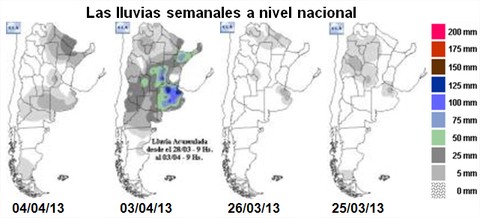 Durante la semana se presentaron lluvias extremas en gran parte de la región GEA, superando ampliamente los promedios zonales. La distribución de las lluvias tuvo dos máximos, uno sobre la provincia de Buenos Aires y sur de Santa Fe, y el otro sobre el noroeste de la región GEA, con valores que superan los 100 mm.