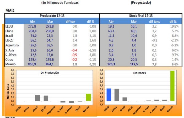 El Departamento de Agricultura de los Estados Unidos (USDA, por sus siglas en inglés) relevó en su último reporte de oferta y demanda un sorpresivo incremento en las existencias mundiales de maíz, trigo, y soja, al tiempo que realizó una revisión a la baja en las importaciones chinas de soja para el ciclo 2012/13.