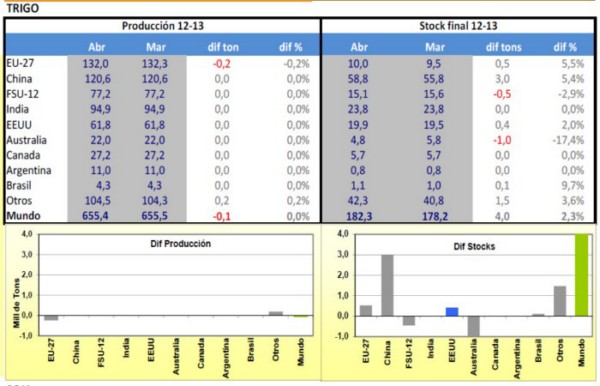 Trigo: A nivel mundial aumenta los stocks en 2,9 M/Tns. por mayor carry-in y un menor consumo forrajero. La producción global 2012/13 queda sin cambios a pesar de revisiones en UE-27 y China entre otros. Se aumentan las exportaciones por correcciones en Australia y FSU-12. La relación Stock/Consumo es de 27%