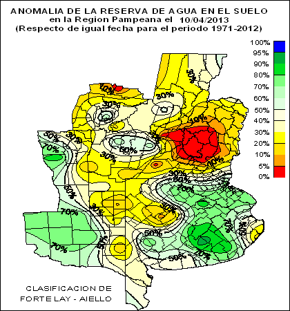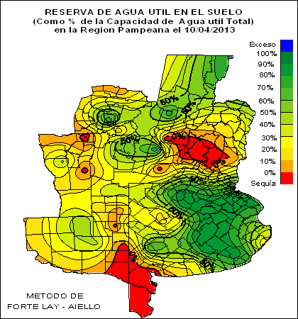 RESERVA DE AGUA ÚTIL EN EL SUELO (como % de la capacidad de agua útil total) en la Región Pampeana el 10 de Abril de 2013
