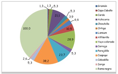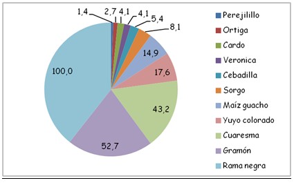 Con estos elementos se demuestra que rama negra tiene una distribución total en la provincia y por su frecuencia de 100 % en los dos momentos es la maleza de menor control dentro de las identificadas.