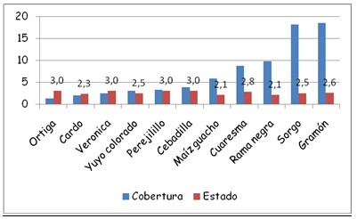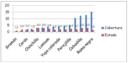 Cobertura y estado de desarrollo de las distintas malezas