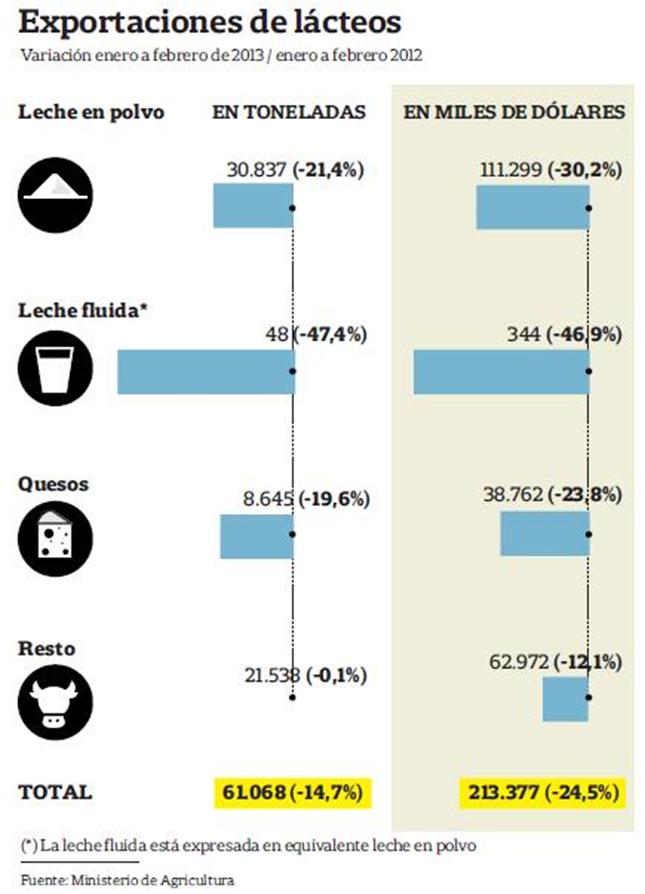 En este contexto, el freno de Moreno conspiró contra un negocio exportador de por sí ya complicado para la Argentina en el comienzo de 2013. De acuerdo con datos oficiales, las ventas acumuladas de enero y febrero para todos los productos lácteos fueron de 61.068 toneladas por 213,3 millones de dólares. Estos números significan una merma del 14,7% en toneladas y del 24,5% en valor versus igual período de 2012.