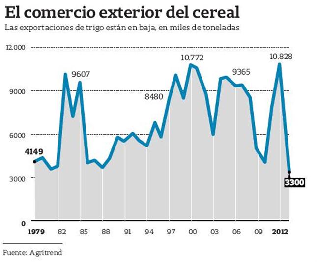 Este año se advertirá una consecuencia negativa más de la política de intervención del Gobierno en el mercado de trigo. Luego de que en 2012 los productores huyeran de la siembra del cultivo y el área quedara, con 3,16 millones de hectáreas, como la más baja desde 1898/1899, en 2013 la Argentina va a tener, con unos 3,3 millones de toneladas, la menor exportación del cereal de los últimos 35 años. Por pérdidas de negocios con el exterior, en la Argentina ya dejaron de ingresar US$ 5200 millones desde 2009.