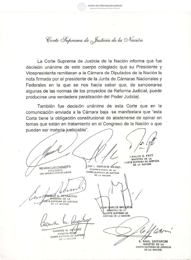 "La Corte Suprema de Justicia de la Nación informa que fue decisión unánime de este cuerpo colegiado que su presidente y su vicepresidente -Elena Highton- remitieran a la Cámara de Diputados de la Nación la nota firmada por el presidente de la Junta de Cámaras Nacionales y Federales en la que se nos hacía saber que, de sancionarse algunas de las normas de los proyectos de reforma judicial, puede producirse una verdadera paralización del Poder Judicial".