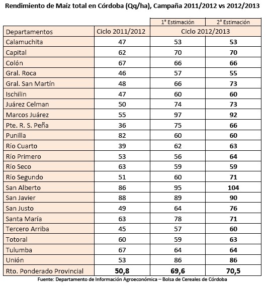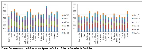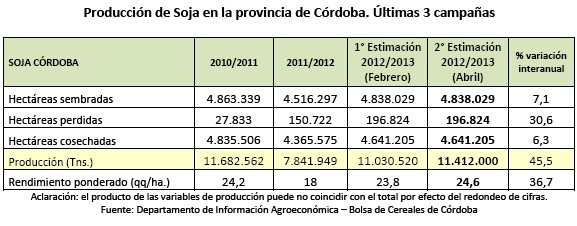Con un avance de cosecha a nivel provincial superior al 75%, el Departamento de Información Agroeconómica de la Bolsa de Cereales de Córdoba estima que la producción de soja en Córdoba campaña 2012/2013 es de 11.412.000 Tns., lo cual representa un incremento del 45,5% respecto al ciclo anterior.