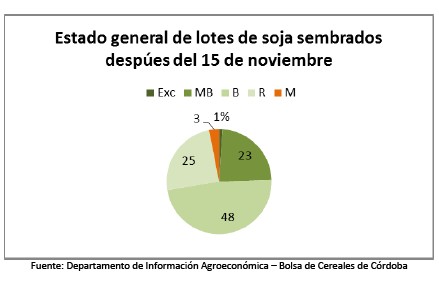 En el caso de sembradíos tardíos (52% del área sojera de Córdoba), lo que resta de cosechar fenológicamente están entre fin de llenado a madurez de cosecha. El estado general indica que el 23% corresponde a una condición muy buena para la oleaginosa.
