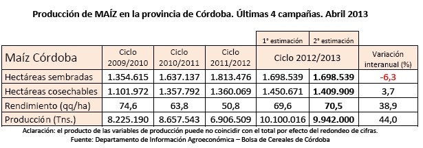 En la segunda estimación provisoria de producción de maíz para la presente campaña 2012/2013 se calcula en 9.942.079 Tns., un 44% superior que la campaña pasada 2011/2012, valor que se sigue ajustando durante el transcurso del ciclo del cultivo y el avance de cosecha.